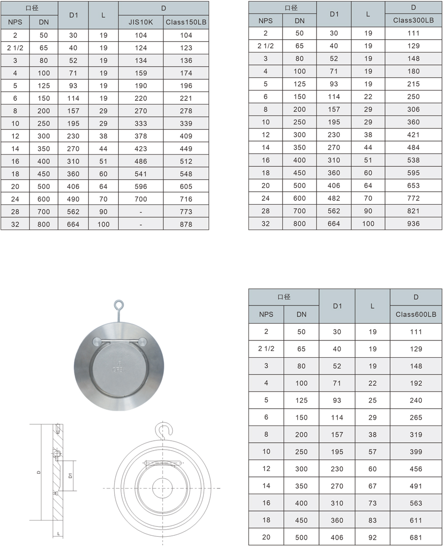 對夾式止回閥適用于公稱壓力PN1.0MPa~42.0MPa、Class 150~2500 ;公稱通徑DN15~1200mm、NPS1/2~48;工作溫度-196~54OC℃的各種管路上,用于防止介質倒流。通過洗用不同的材質,可適用于水、蒸汽、油品、硝酸、醋酸、強氧化性介質及尿素等多種介質。